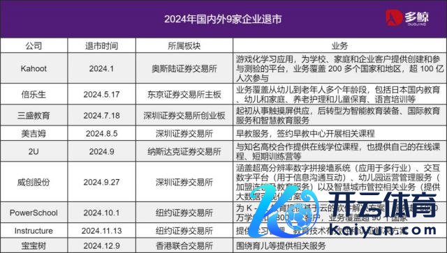 3、2024 年,国表里有 9 家企业退市 在 2024 年也有企业因商场环境和股价推崇的影响、政策监管和财务合规的压力、战术调和等多种要素纷纷退市。国表里共有 9 家企业因政策、事迹压力等原因纷纷退市。 2024 年 7 月,*ST 三盛公布,因 2022 年度财务司帐申诉被出具无法表深远见的审计申诉,并在法如期限内未能走漏 2023 年年度申诉,凭据深交所《创业板股票上市规定》章程,公司股票将拒绝上市。 好意思吉姆则是因早教中心数目暴减,股价握续低迷,最终被退市。好意思吉姆在 2024 年 7 月发公告露馅,股票在 2024 年 5 月 16 日至 6 月 13 日历间,通过深交所交游系统流畅二十个交游日的逐日股票收盘价均低于 1 元,触及深交所《股票上市规定(2024 年矫正)》章程的股票拒绝上市。 堪称「母婴第一股」宝宝树自 2018 年上市后,事迹运行下滑,2019 年至 2022 年期间累计失掉超过 39.51 亿元。此外,跟着诞生东谈主口下滑和商场竞争加重,宝宝树的流量和商场份额缓缓萎缩。随后宝宝树还经历过高层更迭、财务风云等导致停牌,之后未能在章程时刻内完成复牌指引条款,而被条款退市。