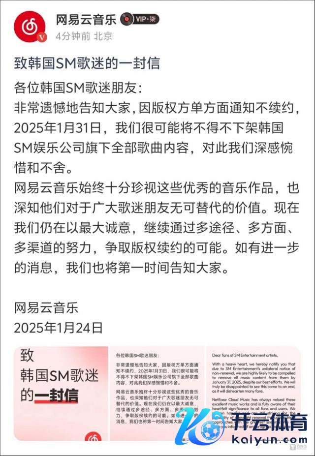 图片由 AI 生成 K-POP 粉丝嗅觉"天塌了"。 1 月 24 日,网易云音乐发布《致韩国 SM 歌迷的一封信》称,因版权方片面告知不续约,网易云音乐很可能不得不于 1 月 31 日下架韩国 SM 文娱公司旗下一齐歌曲实质。 网易云音乐还暗意,仍在以最大衷心,接续通过多蹊径、多方面、多渠说念的发愤,争取版权续约的可能。